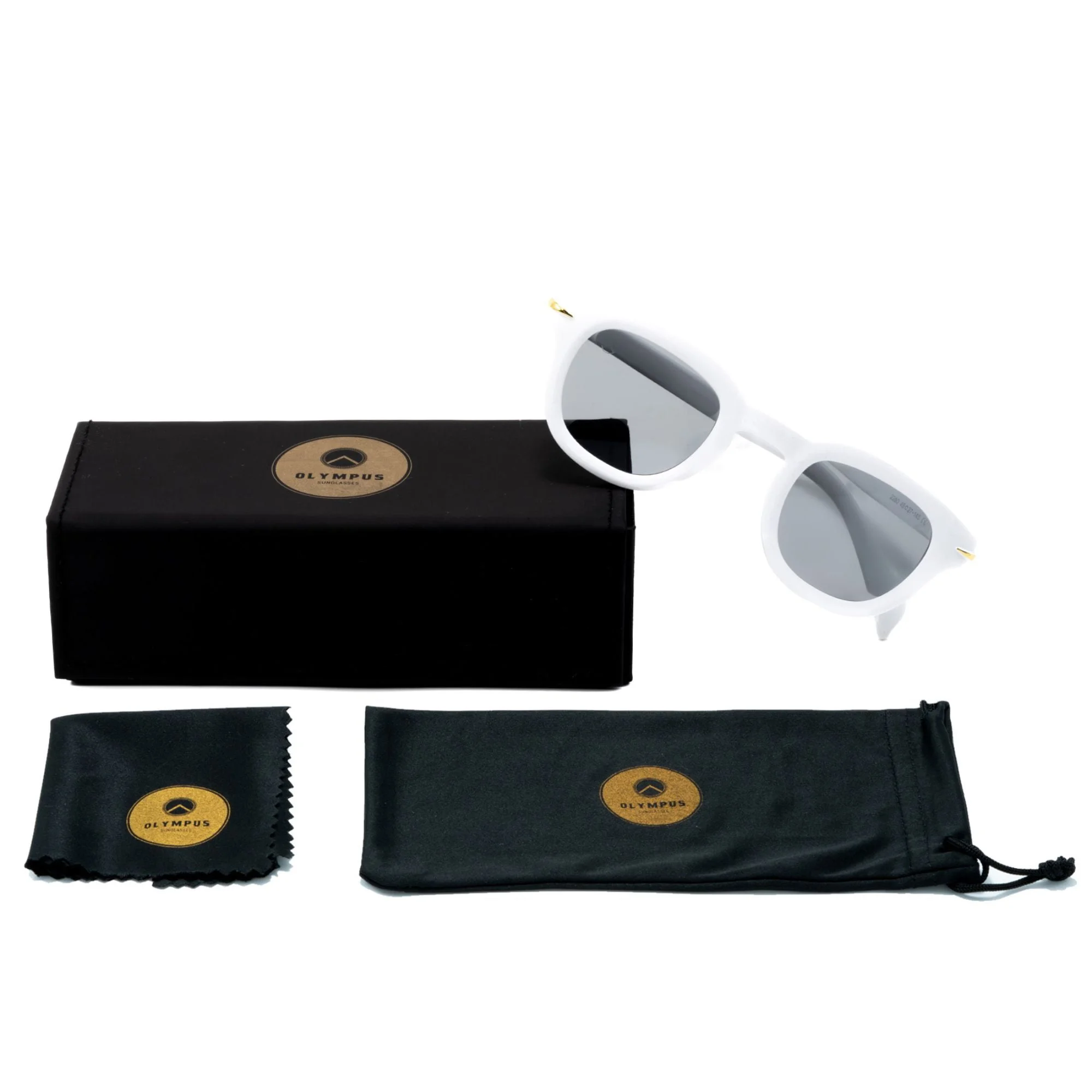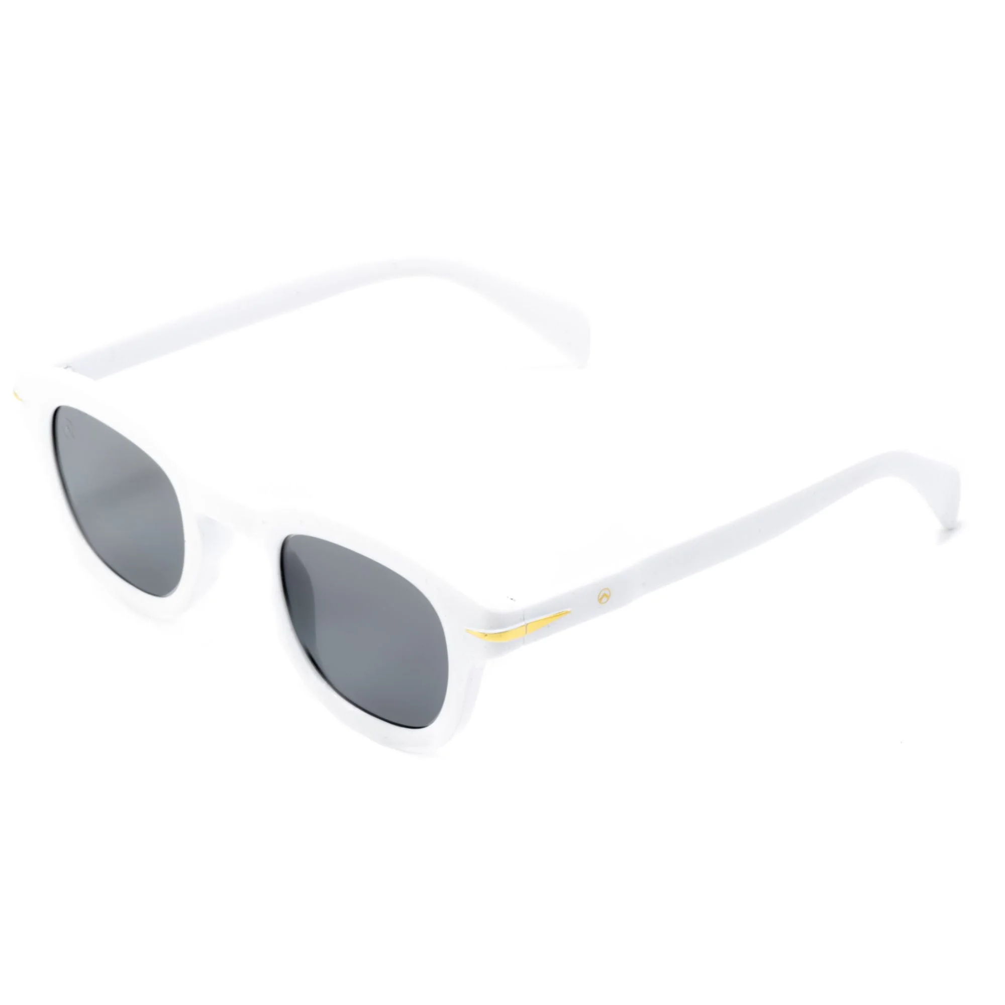 Unisex γυαλιά ηλίου Olympus Nestor White με σκελετό από pvc σε λευκό χρώμα, χρυσές μεταλλικές λεπτομέρειες και στρογγυλό φακό σε μαύρο χρώμα. Ένα ιδιαίτερο γυαλί ηλίου που ταιριάζει σχεδόν σε όλα τα πρόσωπα ενώ παράλληλα προστατεύει από την υπεριώδη ακτινοβολία.