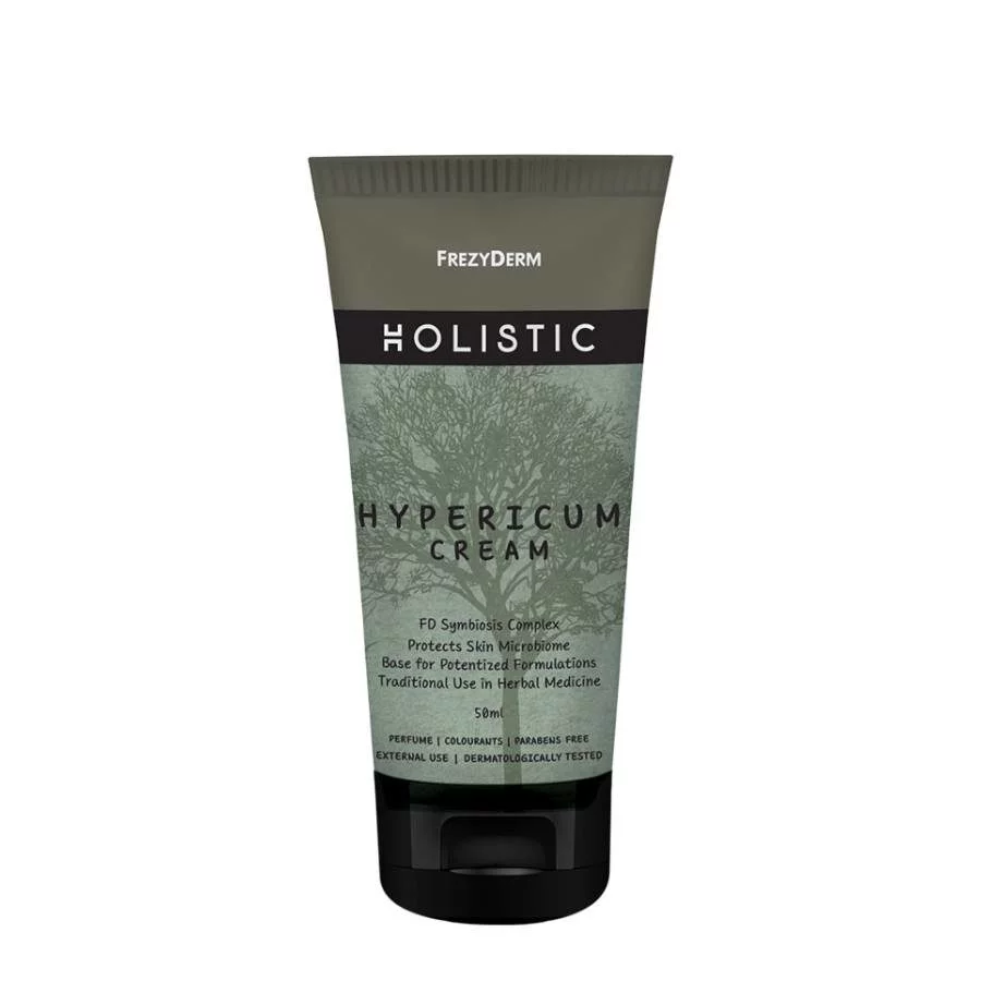 Η Frezyderm Hypericum Cream είναι μια ολιστική κρέμα για πρόσωπο και σώμα που μειώνει τους ερεθισμούς και διαθέτει αναδομητική δράση. Χάρη στο καινοτόμο δραστικό συστατικό FD Symbiosis Complex που περιλαμβάνει η σύνθεσή της, ενισχύει αποτελεσματικά τον δερματικό φραγμό, διατηρεί την ισορροπία της δερματικής χλωρίδας και βοηθά το δέρμα να αποβάλλει τις τοξίνες. Παράλληλα, η συνεργιστική δράση Hypericum Perforatum και Πασιφλόρας αναδομεί τον δερματικό ιστό αναπλάθοντας το δέρμα, μειώνει τους ερεθισμούς και προσφέρει δερματική άνεση.