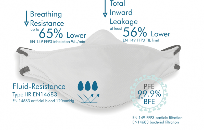 Καινοτομική τρίπτυχη σχεδίαση για άνετη εφαρμογή με ιμάντες πίσω από το κεφάλι για να μην καταπονούνται τα αυτιά, σπόγγο κάτω από το επιρίνιο έλασμα για ενισχυμένη προστασία/στεγανότητα και άνετη εφαρμογή, χωρίς να εφάπτεται στα χείλη κατά την ομιλία, ιδανική για καθημερινή χρήση σε χώρους εργασίας κλπ για τουλάχιστον 8 ώρες, χωρίς ανάγκη χρήσης δεύτερης μάσκας.