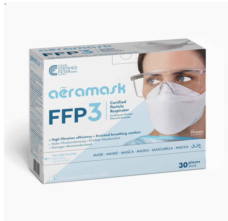 Η Aēramask™ FFP3 είναι πιστοποιημένη μάσκα προστασίας αναπνοής από στερεά και (μη-πτητικά) υγρά σωματίδια όταν φορεθεί σωστά. Η προσφορά αφορά σε μία μόνον μάσκα