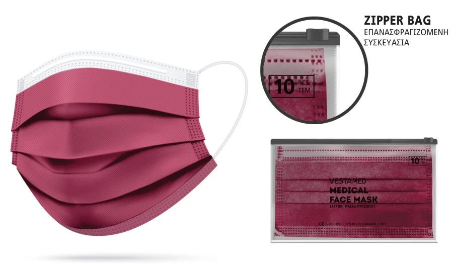 Χειρουργικές  μάσκες προστασίας μιας χρήσης τριών στρώσεων σε μπορντό χρώμα. 10 Τεμάχια σε πλαστικό Zip Bag που μπορεί να επανασφραγιστεί.  Κατασκευάζονται στην Ελλάδα.
