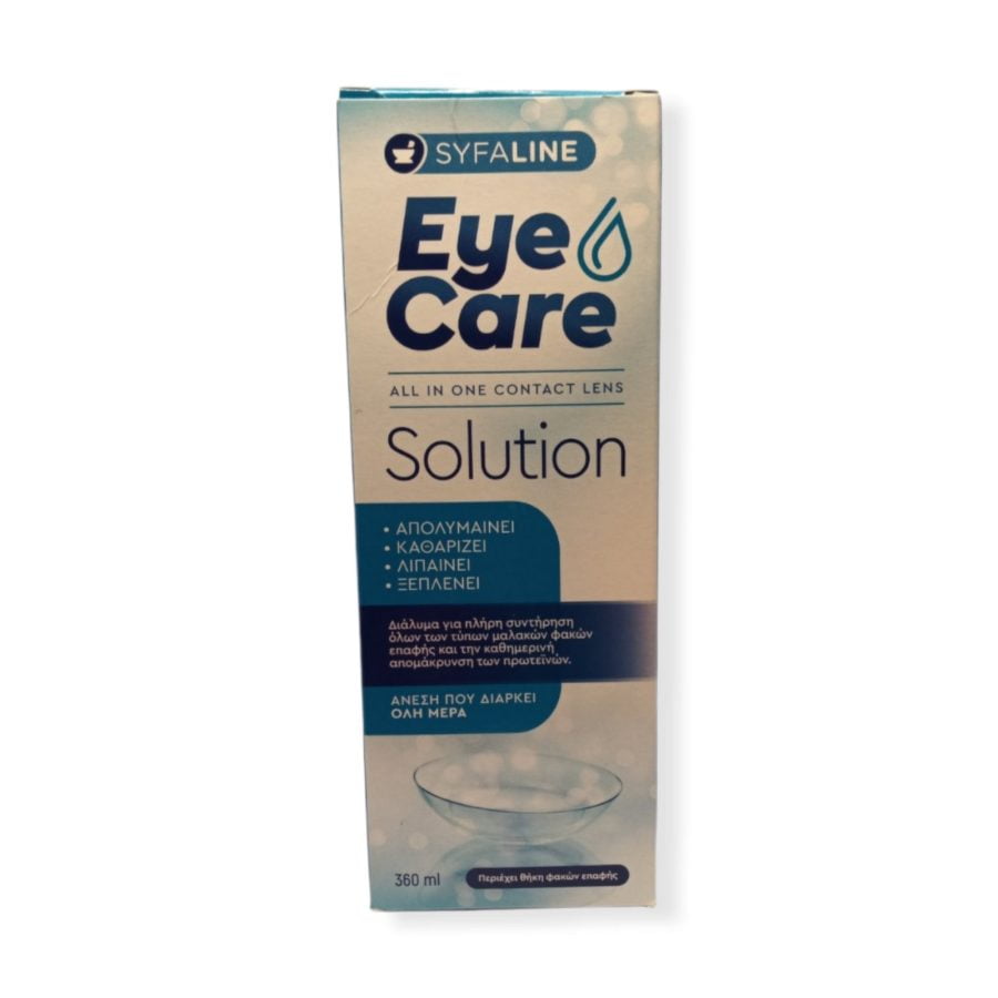 Το EyeCare “All In One Contact Lens” Solution της Syfaline είναι ένα υγρό φακών επαφής “όλα σε ένα”, ιδανικό για πλήρη συντήρηση όλων των τύπων μαλακών φακών επαφής. Κατάλληλο για απολύμανση, αποθήκευση, καθαρισμό, λίπανση, έκπλυση και απομάκρυνση υπολειμμάτων πρωτεϊνών από όλη την επιφάνεια των φακών επαφής. Παρέχει άνεση που διαρκεί όλη την ημέρα. Η συσκευασία περιέχει εκτός από το διάλυμα 360 ML και μια θήκη φακών επαφής.
