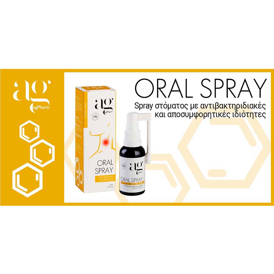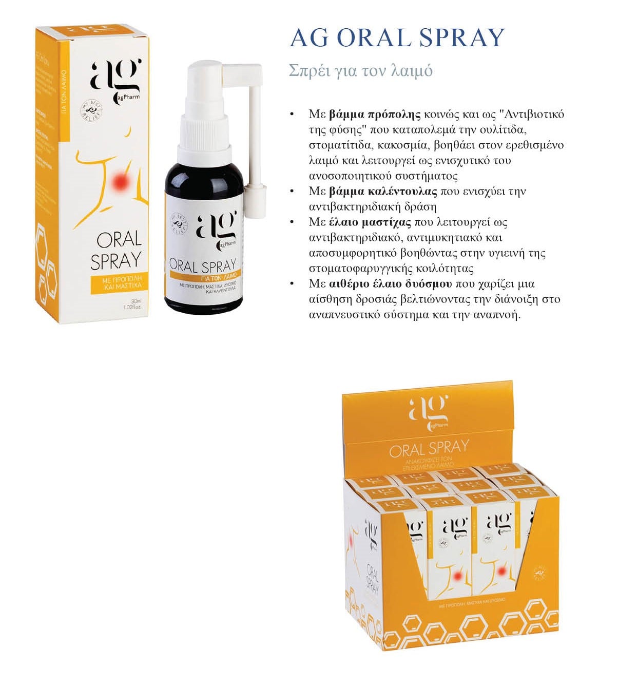 Το Oral Spray της Ag Pharm για τον λαιμό, είναι ένα φυσικό προϊόν με πρόπολη, μαστίχα και εκχυλίσματα βοτάνων.
