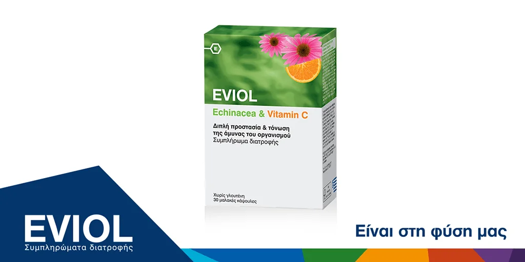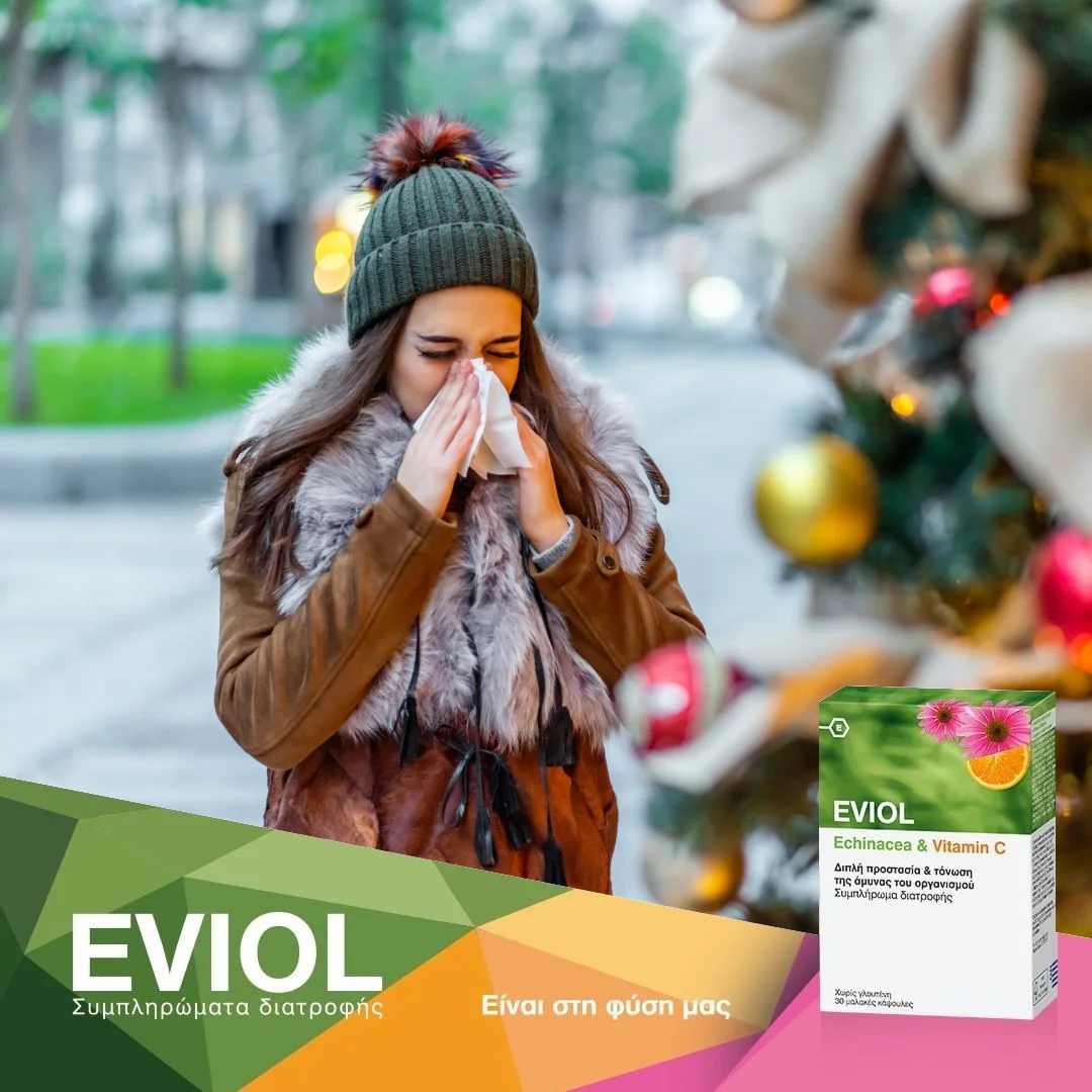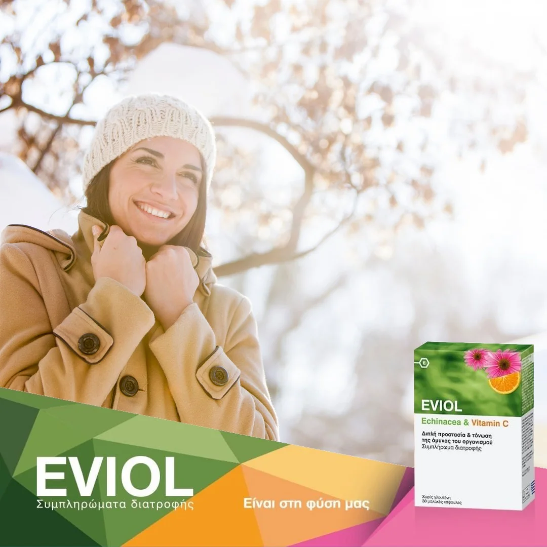 Συμπλήρωμα διατροφής EVIOL με Εχινάκεια και Βιταμίνη C. Ένας ιδανικός συνδυασμός για την πρόληψη και αντιμετώπιση των «επιθέσεων» του χειμώνα συμβάλλοντας στην ενίσχυση της άμυνας του οργανισμού και στη φυσιολογική λειτουργία του ανοσοποιητικού συστήματος.